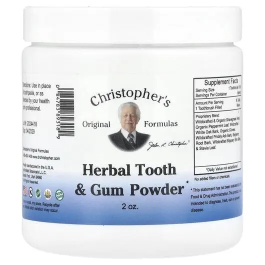 Травяной порошок для зубов и десен Christopher's Original Formulas способствует укреплению зубов и десен.