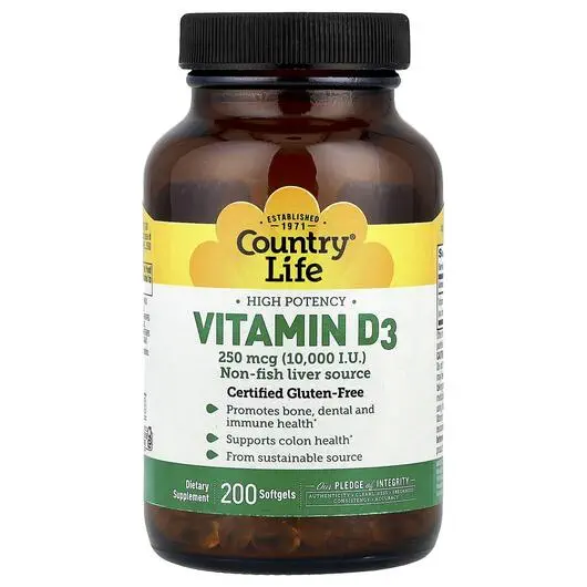 Витамин D способствует усвоению кальция, помогает формировать костную систему и зубы, а также поддерживать их здоровье. Кроме того, он поддерживает здоровье толсто кишки и иммунной системы. Высокоэффективный витамин D Country Life, 10 000 МЕ, получают из ланолина, экологичного и безопасного источника, являющегося основой для среднецепочечных триглицеридов (СЦТ). Также доступен в дозировках 1000, 2500 и 5000 МЕ.