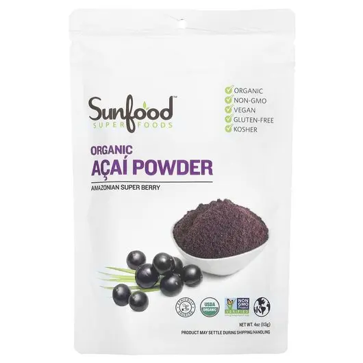 Асаи, невероятный суперпродукт родом из Южной Америки, содержит комплекс антиоксидантов, витаминов и аминокислот. Асаи содержит жирные кислоты омега-3 и омега-6, а также омега-9, которые необходимы для работы головного мозга. Богатая питательными веществами асаи стала любимым продуктом спортсменов и людей, заботящихся о своем здоровье. Темно-фиолетовый цвет асаи торговой марки Sunfood обеспечивают пигменты, которые называются антоцианины, мощные антиоксиданты, которые защищают организм от вредного воздействия свободных радикалов.