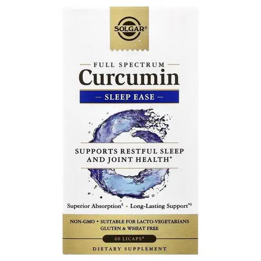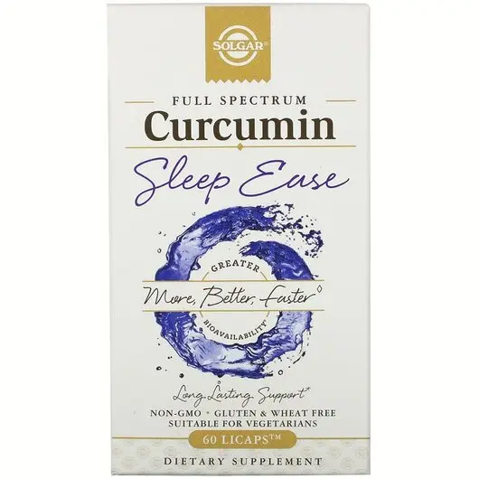 Больше, лучше, быстрее. Это отличительное свойство куркумина полного спектра от Solgar. При растворении в жире его абсорбция и биодоступность достигают невиданных ранее уровней. В Solgar содержится не плохо усваиваемый жирорастворимый куркумин, а водорастворимая форма этого фитонутриента ... он готов к употреблению, быстрее усваивается и обладает максимальной возможной активностью. Теперь Solgar Full Spectrum Sleep Ease сочетает в себе силу куркумина полного спектра с PharmaGABA для быстрого восстановления душевного спокойствия и Venetron с мелатонином для борьбы с периодической бессонницей ... Вы засыпаете быстрее и спите дольше. При приеме на ночь GABA способствует расслаблению, мелатонин обеспечивает спокойный, безмятежный отдых, а быстро усваиваемый куркумин оказывает успокаивающее антиоксидантное действие. Окислительный стресс может возникать в результате избытка свободных радикалов, признаком которого является дискомфорт в суставах. В результате приема данного препарата, просыпаясь утром, вы чувствуете себя обновленным и отдохнувшим. Теперь Solgar позволяет вам извлечь максимум из ночного сна. Принимайте по две капсулы с жидким экстрактом куркумина полного спектра Solgar Sleep Ease один раз в день перед сном ... ночной сон может быть таким комфортным. Полнота усвоения имеет значение Одна из проблем, связанных с приемом куркумина, заключается в том, что организм может усвоить и фактически использовать ограниченное количество данного вещества. При повышении усвояемости увеличенное количество активного куркумина оказывает антиоксидантное действие на различные системы организма. Наконец, Solgar выводит биодоступность и усвояемость на совершенно новый уровень.Вместо обычного порошка куркумы компания Solgar предлагает 95%-й экстракт куркумина — очищенную и концентрированную стандартизированную активную форму, извлеченную из природного корня куркумы (Curcuma longa). Впервые компании Solgar удалось выделить и заключить стандартизированный экстракт куркумина в оболочку из микроскопических «влаголюбивых» сфер — мицелл. Мицеллы значительно повышают степень абсорбции, они настолько микроскопически малы, что позволяют куркумину легко попасть в кровоток. При таком размере мицеллы практически невидимы и способны превращать плотный и непрозрачный порошок в кристально чистую жидкость с повышенной усвояемостью. Чем прозрачнее жидкость, тем выше усвояемость. Чем выше усвояемость, тем выше биодоступность. А чем выше биодоступность ... тем эффективнее куркумин. Усвоение более быстрое и полное, а эффект более длительный, чем когда-либо прежде - Куркумин полного спектра Sleep Ease. Больше, лучше, быстрее. Сформулировать этот девиз позволило тестирование с участием людей, в ходе которого куркумин NovaSOL сравнивали с природным экстрактом куркумина на основании объективных критериев (анализа метаболитов). Растительный глицерин, полисорбат 80 (эмульгатор), растительная целлюлоза, гамма-аминомасляная кислота, экстракт листьев кендыря синеватого, экстракт корневища куркумы, мелатонин, концентрат фиолетовой моркови (краситель)Не содержит глютена, пшеницы, сои, сахара, натрия, искусственных ароматизаторов и подсластителей.