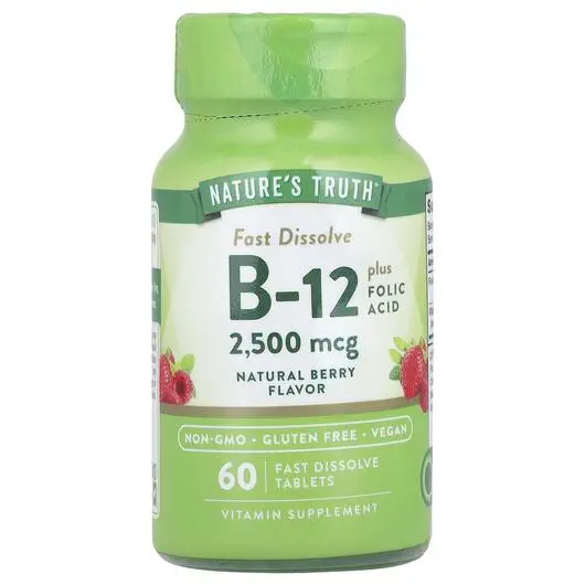 Витамин B12 содержится в различных продуктах, таких как рыба, мясо и яйца; однако некоторые люди, которые регулярно употребляют эти продукты, могут не получать достаточно необходимого витамина B12 в своем ежедневном рационе. 2500 мкг быстрорастворимого витамина B-12 от Nature's Truth гарантирует, что вы будете получать достаточное количество этого важного витамина каждый день.