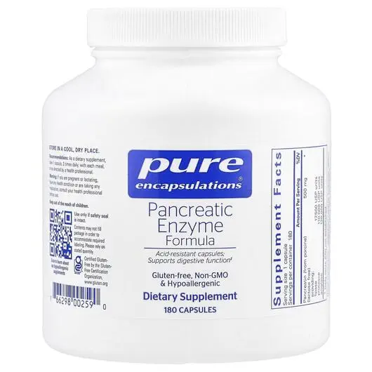 Размер порции: 1 капсула Количество порций в упаковке: 180 Количество на порцию / Панкреатин (свиной) (без лактозы) 500 мг / Обеспечение: Липаза 17 500 единиц USP Протеаза 110 000 единиц USP Амилаза 120 000 единиц USP дневная норма (ДВ) не установлено. Другие ингредиенты: Вегетарианская капсула (целлюлоза, геллановая камедь, вода). Без глютена/без ГМО/гипоаллергенно.