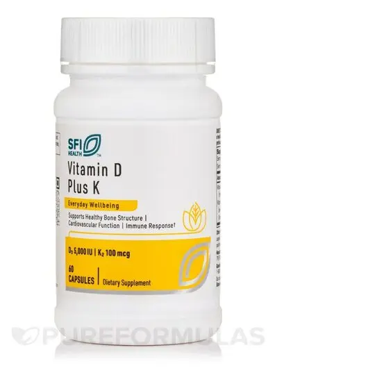 Витамины D и K являются структурно сходными жирорастворимыми витаминами. Синергически они поддерживают здоровый метаболизм кальция и минерализацию костей во всем организме, а также здоровый баланс кальция в сосудистых тканях. Витамин D также связан с факторами риска сердечно-сосудистых заболеваний. Недавние исследования показали, что витамины D и K поддерживают здоровое функционирование как врожденного, так и адаптивного иммунного ответа. Витамин D Plus K от Klaire представляет собой биодоступную комбинацию 5 000 МЕ витамина D3 (холекальциферола) и 100 мкг витамина K2 (менахинон-7, МК7).