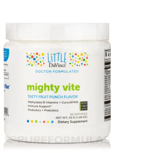Mighty Vite — это восхитительный поливитамин со вкусом фруктового пунша, который объединяет важные питательные вещества, необходимые для поддержания здоровья вашего ребенка. В отличие от многих детских поливитаминов, это не меловая жевательная резинка или жевательная резинка с сахаром. Вместо этого могучий вайт — это готовый к употреблению порошок, подслащенный стевией. Вы можете легко добавить его в еду или напитки вашего ребенка. Даже самые привередливые едоки оценят его великолепный вкус. Mighty Vite разработан с таким же вниманием к качеству ингредиентов, как и поливитамины для взрослых. Большинство детских поливитаминов включают стандартные витамины группы B. Mighty Vite, с другой стороны, включает в себя активированные формы витаминов группы B, которые организм вашего ребенка может использовать более быстро и эффективно. Могучий виноград содержит кватрефолик, хорошо изученную биоактивную форму фолата. Это лучший выбор, чем фолиевая кислота, для детей с общей мутацией гена. Многие дети с этой мутацией не способны превращать фолиевую кислоту в активную форму фолата. Quatrefolic обеспечивает активную форму фолата, поэтому организм вашего ребенка может немедленно использовать ее. Это особенно полезно для детей, которым нужна помощь в поддержании здорового внимания. Mighty Vite также включает CurcuWIN — форму куркумина, которая в 46 раз лучше усваивается организмом, чем стандартный куркумин. Куркумин поддерживает здоровье пищеварения у детей, а также здоровую воспалительную реакцию и функцию мозга. Более того, бузина и цинк добавляются для укрепления иммунитета в течение всего года. Цинк также поддерживает оптимальные темпы роста и пищеварения у детей. Другие уникальные дополнения к формуле? Пробиотик Bacillus coagulans изучался на предмет его благотворного воздействия на поддержание здоровья пищеварительной системы у детей. Кроме того, пребиотики в мощном витамине, такие как инулин и SunFiber, улучшают здоровье полезных кишечных бактерий вашего ребенка и поддерживают здоровую функцию кишківника.
