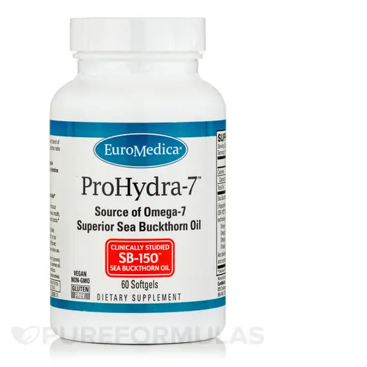 ProHydra-7 содержит SB-150, клинически изученное облепиховое масло, которое содержит более 200 питательных веществ. SB-150 также содержит питательные незаменимые жирные кислоты (включая Омега-3, 6, 9 и Омега-7), также известные как пальмитолеиновая кислота. ProHydra-7 помогает организму удерживать влагу там, где она больше всего необходима. Конечно, не все продукты из облепихи содержат жирные кислоты Омега-7. Это потому, что Омега-7 содержится только в мякоти ягоды, а не в масле семян. Однако масло семян содержит незаменимые альфа-линоленовую и линолевую жирные кислоты, полезные омега-3 и омега-6. И мякоть, и масло семян содержат витамин Е (токоферолы и токотриенолы) и растительные стеролы. ProHydra-7 обеспечивает непревзойденное сочетание того и другого! Этот полный экстракт облепихи, включающий ягоды и семена, обеспечивает мощные преимущества: В клинических исследованиях показано, что он уменьшает сухость и улучшает гидратацию кожи до 48% Обновляет сухие слизистые оболочки по всему телу Успокаивает желудочно-кишечный тракт Улучшает здоровье и эластичность кожи ProHydra-7 обеспечивает лучший экстракт облепихи, полученный из экологически чистых источников, собранный и экстрагированный с заботой о вашем здоровье и будущем. Это действительно уникальная добавка из облепихи: Содержит 150 мг омега-7 на капсулу Снимает сухость и улучшает гидратацию кожи до 48% в клинических исследованиях Обновляет сухие слизистые оболочки Успокаивает желудочно-кишечный тракт Улучшает здоровье и эластичность кожи ProHydra-7 помогает омолаживать кожу и слизистые оболочки ткани, выстилающие глаза, рот, желудочно-кишечный тракт, вагинальные и мочевыводящие пути.