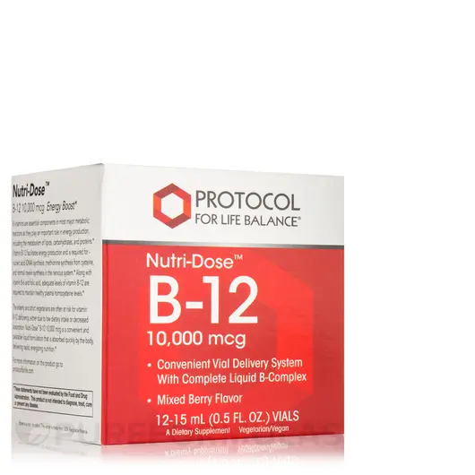 Одна упаковка Nutri-Dose B-12 10 000 мкг от компании Protocol for Life содержит достаточно флаконов, которых хватит на 12 дней, если вы принимаете один флакон объемом 15 мл в день.