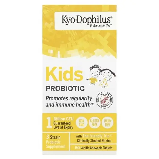Разжевывайте по одной таблетке детского пробиотика Kyo-Dophilus каждый день во время еды, чтобы укрепить здоровье ЖКТ и иммунной системы, а также улучшить общее самочувствие.