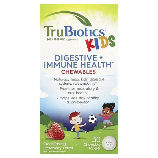 Ваши дети будут в восторге от новых жевательных таблеток TruBiotics с клубникой! Это единственные детские жевательные таблетки с 2 наиболее клинически изученными штаммами пробиотиков в мире. Клинически доказано, что это мощное сочетание полезных бактерий помогает улучшить работу пищеварительной системы детей, уменьшает дискомфорт в верхних дыхательных путях, сокращает количество пропущенных дней дневного ухода за детьми и поддерживает их развивающуюся иммунную систему. Ежедневно пополняйте микробиом ребенка с помощью жевательных таблеток TruBiotics для непревзойденной поддержки иммунной системы пищеварения.