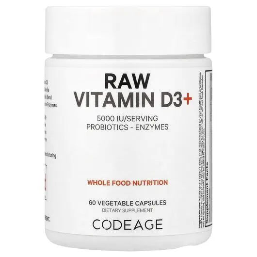 Codeage Raw Витамин D3+ сочетает в себе 5000 МЕ витамина D3 с органическими фруктами, овощами, омега-9, ферментами и пробиотиками для целостного питания и поддержки здоровья. Запас на 2 месяца.