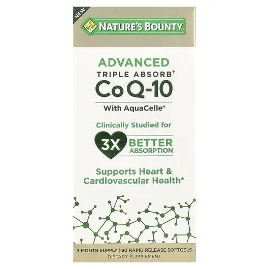 Advanced Co Q-10 для вашего сердца Наш Nature's Bounty Advanced Triple Absorb Co Q-10 отличается технологией AquaCelle, которая обеспечивает в 3 раза лучшее усвоение по сравнению со стандартным Co Q-10. Наша формула разработана для обеспечения оптимальной поддержки Co Q-10 для здоровья сердечно-сосудистой системы.