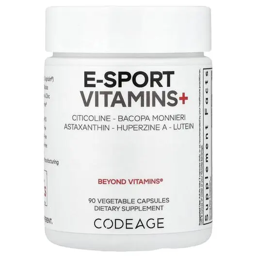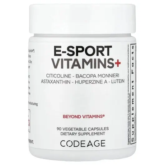 Codeage E-Sport Vitamins+ содержит премиальную смесь Cognizin, запатентованную форму Citicoline, Bacopa Monnieri, Astaxanthin, Huperzine A, L-теанина, N-ацетил L-тирозина, Ginkgo Biloba и BioPerine. Обогащен витаминами B6, B12, D3, глицинатом магния и цинком.