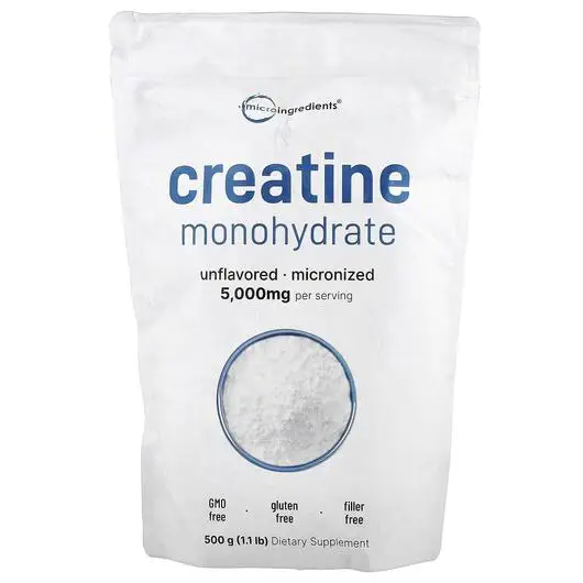 Micro Ingredients чистый микронизированный порошок моногидрата креатина. Натуральная добавка для тренировок для мужчин и женщин, не имеющая вкусовых добавок и разработанная для легкого растворения в любом напитке или порошковом напитке для приема перед и после тренировки.