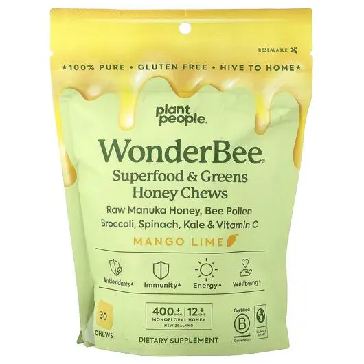 WonderBee + Greens — это питательный ежедневный суперпродукт для хорошего самочувствия и бодрости, содержащий одну порцию овощей на жевание с проверенными временем фитонутриентами и антиоксидантами, включая мед манука, брокколи, морковь, шпинат, брюссельскую капусту и капусту кале.