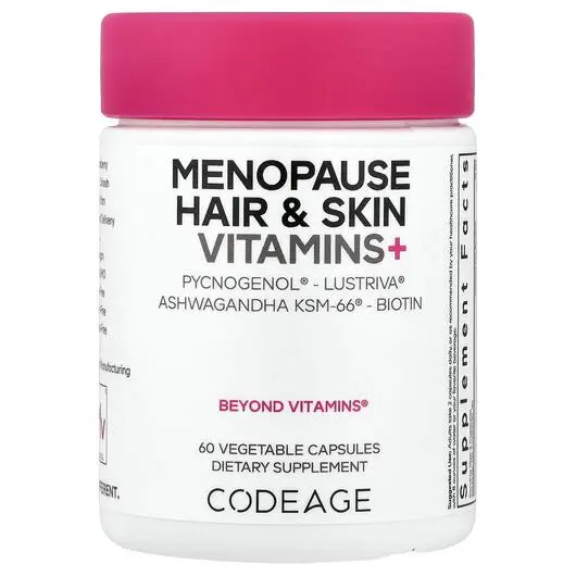 Витамины Codeage Hair Skin Vitamins+ для людей в период менопаузы также содержат 10 000 мкг биотиновой добавки и содержат ашваганду KSM-66 — ингредиент, роль которого в поддержке женщин в период перименопаузы и изменений среднего возраста была клинически изучена.