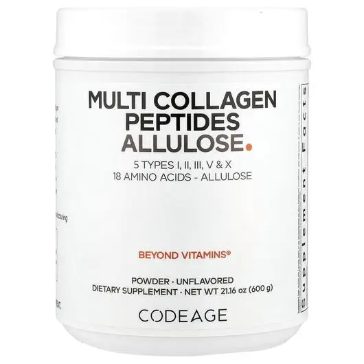 Codeage Multi Collagen Peptides Allulose — это уникальная формула добавки, сочетающая 5 видов коллагена с 18 аминокислотами и аллюлозой, редким сахаром с чистым, слегка сладким вкусом. В ней 0 калорий, 0 чистых углеводов и 0 гликемических индексов, что делает её уникальной, не имеющей вкуса и удобной для смешивания порошковой добавкой на основе коллагена и аллюлозы.