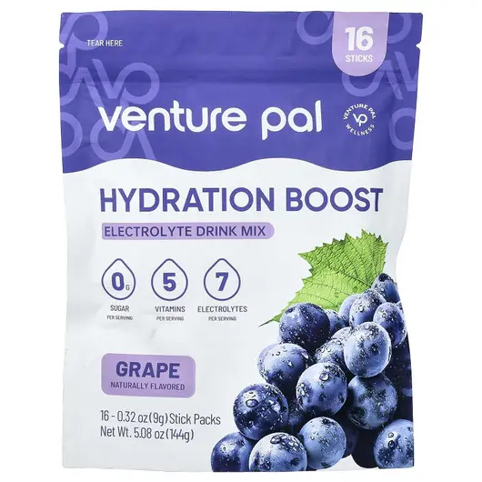 Электролиты Hydration Boost Electrolyte Drink Mix Grape 16 Stick Packs 9 g Each, Venture Pal