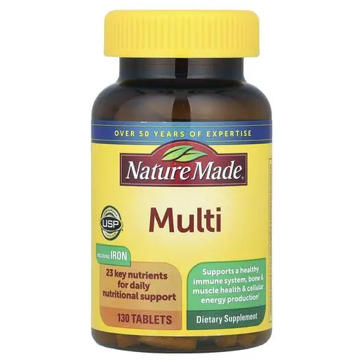 Додавання мультивітамінів до вашого щоденного раціону може допомогти забезпечити ваш організм необхідними поживними речовинами. Nature Made Multi with Iron спеціально розроблений з 23 ключовими поживними речовинами, щоб допомогти заповнити потенційну нестачу поживних речовин у вашому раціоні, включаючи поживні речовини для підтримки здорової імунної системи, здоров'я кісток і м'язів, функції клітин мозку та вироблення клітинної енергії. Все в одній щоденній таблетці.