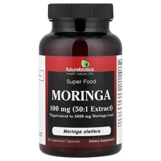 Futurebiotics Moringa - це 100% вегетаріанська добавка, яка містить 5000 мг вищого листя морінги (від 100 мг екстракту листя Moringa oleifera 100: 50) у кожній капсулі.