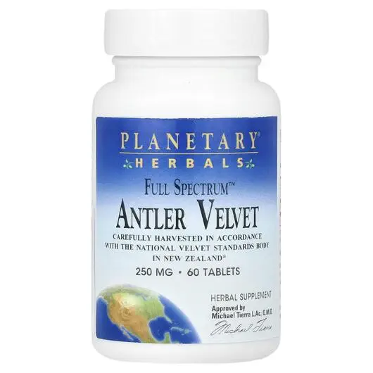 Planetary Herbals Full Spectrum Antler Velvet це тонізуючий засіб, який широко використовується в Китаї вже більше 2000 років. Пантовий оксамит є ранньою стадією росту пантів і є багатим джерелом колагену, глікозаміногліканів і глікопротеїнів. Оксамит пантів регенерується щороку та збирається з великою обережністю гуманним способом спеціально навченими фермерами або ветеринарами, які відповідають вимогам Національного органу зі стандартизації оксамиту (NVSB) Нової Зеландії. Традиційно пантовий оксамит використовувався для відновлення, балансу та зміцнення тіла, підтримки функції суглобів і культивування загального відчуття благополуччя.