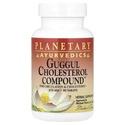 Гуггул є найбільш широко використовуваною з усіх аюрведичних смол. Подібно до мирри, гуггул традиційно класифікується як засіб для очищення та омолодження. Сучасні дослідження показують, що він підтримує здоровий рівень холестерину, прискорює обмін жирів і сприяє здоровій роботі щитоподібної залози. Planetary Ayurvedic Guggul Cholesterol Compound унікальний тим, що містить легендарну трифалу, найбільш шановану сполуку в 5000-річній аюрведичній традиції.