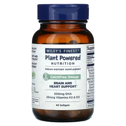 Щоденна підтримка від голови до серця. Омега без улову: Мяка капсула Омега-3 із повним спектром поєднує понад 700 мг омега-3 без риби, 25 мкг веганського вітаміну K2 і 25 мкг веганського вітаміну D3 для живлення вашого серця та мозку та підтримки загального здоров'я і імунне здоров'я. Може зменшити ризик ішемічної хвороби серця. Підтримуюче, але не остаточне дослідження показує, що споживання EPA та DHA омега-3 жирних кислот може знизити ризик ішемічної хвороби серця. Одна порція CatchFree Omega: Full Spectrum Omega-3 Softgel містить 505 міліграмів EPA та DHA омега-3 жирних кислот. Вітамін K2 підтримує здоров'я серця та кровообігу. DHA живить ваш мозок і підтримує здорову роботу мозку.Cathchfree Omega: повний спектр Omega-3 SoftgelУ нашій безрибній харчовій добавці Омега-3 немає нічого страшного, розробленого спеціально для здорового серця, здорової роботи мозку та щоденного здоров'я з голови до ніг. CatchFree Omega: Повний спектр Omega-3 Softgel містить DHA Omega-3 від Algarithmm Omega-3-6-9 від Ahiflower, вітамін K2 як MenaQ7 і Vitashine Вітамін D3. Наша історіяЕксперти з олій Omega-3 Wileys дослідили весь світ щоб запропонувати вам найкращі інноваційні веганські варіанти Омега-3 для вашого оптимального здоров'я. Виготовлений відповідно до найвищих американських і міжнародних стандартів якості, CatchFree Omega виготовляється з найкращих інгредієнтів, отриманих від виробників, які є кваліфікованими експертами у своїй справі. З гордістю зроблено з Algarithm: Свіжа, без риби, без ГМО та без розчинників, веганська DHA Omega-3 з водоростей. Ahiflower: повний спектр, збалансоване рослинне джерело незамінних омега, які допомагають живити ваше тіло. MenaQ7 K2: від ферментований нут без ГМО без сої.Vitashine: 100% веганський вітамін D3 у вигляді холекальциферолу.