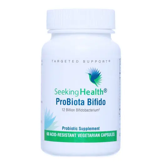 ProBiota Bifido від Seeking Health містить 12 мільярдів КУО семи ретельно вивчених штамів Bifidobacterium, які знаходяться в основному в слизовій оболонці біля кінця тонкої кишки, а також у товстій кишці та сечостатевих шляхах. Ці специфічні штами Bifidobacterium можуть допомогти в або шкідливі бактерії та виробляючи оцтову та молочну кислоти, які можуть допомогти придушити зростання ворожої флори. Іноді говорять, що здоров'я імунної системи починається в кишківнику. Спеціальні тканини кишківника складають більше 60% загальної імунної підтримки організму. .Ці види пробіотиків також можуть підтримувати імунну систему, конкуруючи з небажаними або шкідливими бактеріями за поживні речовини та простір для колонізації. ProBiota Bifido міститься в кислотостійких капсулах для оптимальної доставки в товсту кишку і не містить пребіотиків для підтримки тих, хто чутливий до специфічних крохмалів та волокон. Оскільки цей продукт складається виключно з біфідобактерій, він може бути ідеальним для тих, хто турбується про потенційного гістаміну. Продукуюча активність деяких штамів бактерій Lactobacillus. Тим, хто віддає перевагу пробіотикам широкого спектру дії, включаючи штами Lactobacillus, рекомендуємо наші капсули або порошок ProBiota 12 .