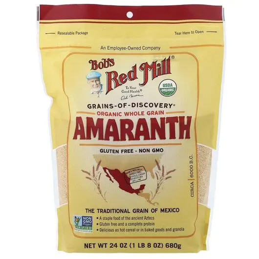 Дорогі друзі, у Bob's Red Mill ми завжди шукаємо нових цільнозернових пригод, і реліквія зерна, як-от амарант, популярна як ніколи. Стародавні ацтеки вважали амарант основним продуктом харчування і називали його «золотим зерном богів». Сьогодні ці «суперзерна» цінуються за чудовий смак і консистенцію, які вони надають пластівцям, гарнірам, першим стравам і випічці. Спробуйте, і ви побачите! За ваше здоров'я, Боб Мур