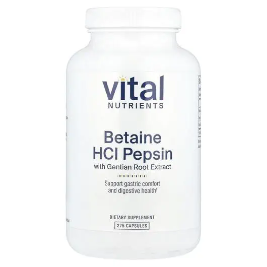 Betaine HCl Pepsin & Gentian Root — це комбінація поживних речовин, які можуть бути корисними для сприяння здоровому травленню, якщо приймати їх на початку їжі. Генціан, гірка трава, поєднується з бетаїном HCl, щоб допомогти підтримувати здоровий pH у шлунку, підтримуючи нормальне перетравлення білків, мінералів, рН у тонкій кишці та всмоктування B12. Пепсин є головним травним ферментом у шлунку, який розщеплює білки на поліпептиди. Чистий нерозрізаний пепсин є кращою формою та не містить лактози, яка може посилити проблеми з травленням у осіб, чутливих до лактози.