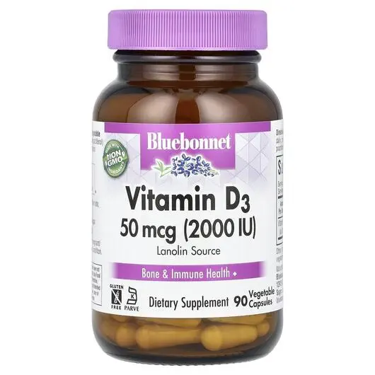 Овочеві капсули Bluebonnet з вітаміном D3 2000 МО (50 мкг) містять вітамін D3 (холекальциферол) з ланоліну, який підтримує міцні, здорові кістки та імунну функцію.