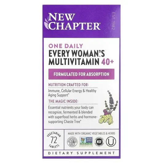 Харчування, створене для:Підтримка імунітету, енергії та здорового старіння. Магія всередині:Основні поживні речовини, які ваше тіло може розпізнати, змішані з суперпродуктовими травами та підтримкою гормонів Chaste TreeПовноцінні полівітаміниДля потреб жінок 40+Експертно розроблено для підтримки цілісних потреб здоров'я жінкам віком від 40 років, з поживними речовинами для підтримки здоров'я серця, мозку, кісток і грудей, підтримки стресу та травлення, а також здорового волосся, шкіри та нігтів.Ферментований цинк і вітамін С і А, що підвищують імунітет і енергію, підтримують функцію імунної системи, а 8 вітамінів групи В сприяють енергетичному обміну.Підтримка здорового старінняЗабезпечує необхідні вітаміни для жінок старше 40 років,Цілісні травиНатхненні традиціями та науковими дослідженнями передові органічні трави включають куркуму, червону конюшину та паростки броколі.Розблоковано за допомогою ферментації Засвоюйте ці вітаміни та мінерали з легкістю, оскільки вони природно ферментовані для засвоєння поживних речовин. Ваш організм сприймає наші мультикі як їжу, тому їх достатньо мяко, щоб приймати їх будь-коли, навіть натщесерце.Сертифікована корпорація B: ця компанія відповідає найвищим стандартам соціального та екологічного впливуНе є єдиним джерелом цієї поживної речовини; також важлива здорова дієта.