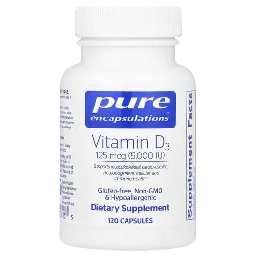 Розмір порції: 1 капсула Порції в упаковці: 120 Кількість на порцію / Вітамін D (у вигляді холекальциферолу) (D3) 125 мкг (5000 МО) / 625% відсотків добової норми (DV). Інші інгредієнти: Гіпоалергенна рослинна клітковина (целюлоза) вегетаріанська капсула (целюлоза вода). Без глютену / ГМО / Гіпоалергенний.