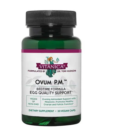 Ovum PM — це формула для підтримки якості яєць для вечірнього використання. Забезпечує антиоксидантну підтримку та поживні речовини для підтримки здорової якості яєць і репродуктивного процесу. Вітамін D позитивно сприяє здоровій якості яйцеклітин Альфа-ліпоєва кислота забезпечує антиоксидантну підтримку для оптимальної якості яйцеклітин і здоров'я фолікулів Діє як антиоксидант Мелатонін підтримує оптимальну якість ооцитів Метильований фолат (L-5-MTHF) є кращою формою фолієвої кислоти для підтримки оптимального ембріонального розвитку; необхідний для здорової вагітності CoQ10 підтримує функцію мітохондрій, ключовий компонент якості яйцеклітин Глутатіон (відновлений) є головним антиоксидантом організму та оптимальним форматом для підтримки детоксикації та здорової клітинної діяльності Показання: здорова якість яйцеклітин є нормальною функцією здорової фертильності . Цю вечірню формулу найкраще використовувати з Vitanica Ovum AM вранці.