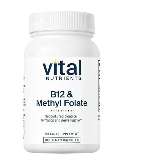 B-12 / фолієва кислота (1000 мкг/800 мкг) від Vital Nutrients забезпечує корисні дози вітаміну B12 і фолієвої кислоти в зручній капсулі для щоденного приймання.