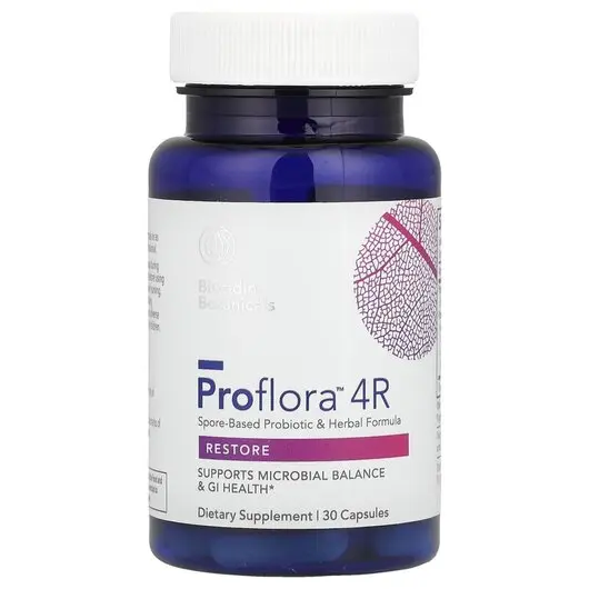Підтримує мікробний баланс і здоров'я шлунково-кишкового тракту Proflora4R — це унікальний пробіотик на основі спор з додатковими рослинними компонентами для підтримки мікробного балансу та здоров'я шлунково-кишкового тракту. Спороутворюючі пробіотики - це симбіотичні бактерії, що знаходяться в нашому шлунково-кишковому тракті. На відміну від звичайних пробіотиків, Proflora4R не потребує охолодження, розроблений, щоб витримувати шлункову кислоту, і зберігає ефективність під час терапії антибіотиками. Комбінація кверцетину, кореня алтея та екстракту алое вера в Proflora 4R забезпечує додаткову поживну підтримку для здорового мікробного балансу всього за одну капсулу на день.
