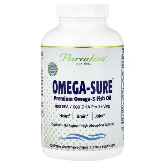 Рибячий жир Paradise Omega-Sure Premium Fish Oil походить від EPAX, провідного світового бренду в Норвегії. Це натуральний тригліцеридний рибячий жир, який містить песко-вегетаріанець і не містить желатину. Більш біодоступний і стабільний, ніж синтетичні етилові ефіри, Omega-Sure є надзвичайно чистим, перевіреним третіми сторонами та гарантовано відповідає або перевищує всі відомі стандарти чистоти для забруднюючих речовин, пестицидів і важких металів. (наприклад, ПХБ, діоксини, фурани, ртуть, свинець та інші забруднення). Ця надзвичайно чиста допомагає усунути неприємний рибний смак, запах і повторювані ефекти, які часто повязані з багатьма іншими рибячими жирами.
