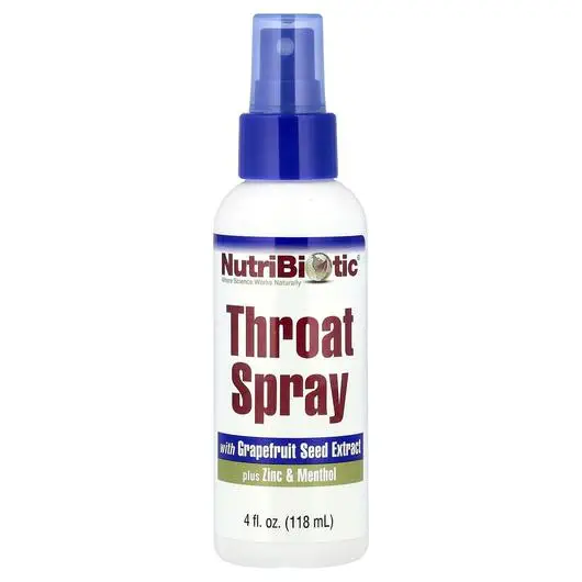 Спрей для горла NutriBiotic з цитрицидалом (екстрактом насіння грейпфрута), цинком та ментолом допомагає сприяти здоров'ю ротової порожнини та горла.
