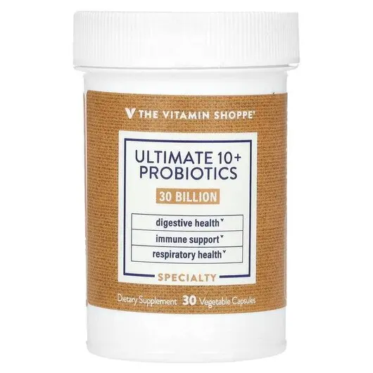 Щасливий кишківник робить вас здоровим. Капсули Ultimate 10+ Probiotic від бренду Vitamin Shoppe, розроблені для підтримки здоров'я органів травлення, дихання та імунітету, містять 30 мільярдів КУО 12 корисних пробіотичних штамів, а також фруктоолігосахариди, які підтримують живлення та процвітання корисних бактерій у вашому травному тракті.