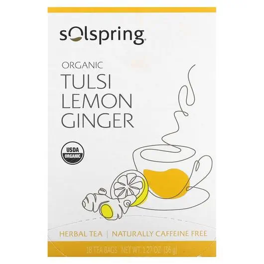 Органічний трав'яний чай Solspring Tulsi з лимоном і імбиром містить тулсі, який вирощують у громаді майже 150 сімейних чайних ферм Magadi третього покоління, розташованих у регіоні Карнатака на південному заході Індії, де ґрунт ідеально підходить для вирощування здорових чайних рослин.