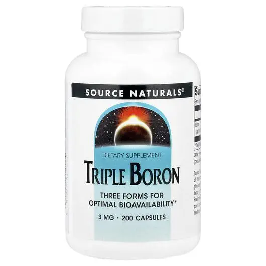 Source Naturals Triple Boron містить три біодоступні форми мікроелемента бору, включаючи одну хелатну форму для покращеної доставки. Сучасні дослідження показують, що бор є фактором підтримки міцних і здорових кісток частково завдяки його позитивному впливу на життєво важливі компоненти власних циклів підтримки кісток організму. Попередні дослідження також показують, що бор може відігравати важливу роль у підтримці здоров'я простати та суглобів, а також когнітивних функцій.