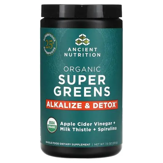 Органічний порошок SuperGreens Alkalize & Detox — ціна суперпродуктової формули, наповнена підщельовою зеленню, овочами, фруктами, травами та грибами... Плюс спеціально розроблена суміш пробіотиків і ферментів для здоров'я травлення. Ця комбінація суперпродуктів забезпечує здорову детоксикацію та баланс pH.