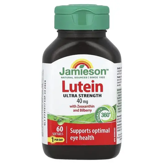 Jamieson Lutein 40 mg Ultra Strength містить зеаксантин і лютеїн, які забезпечують антиоксиданти для підтримки оптимального здоров'я очей. Лютеїн 40 мг містить 1600 мкг зеаксантину, який допомагає підтримувати здоров'я очей при станах, пов’язаних із пошкодженням сонячним світлом, таким як катаракта та вікова дегенерація жовтої плями (ВМД).