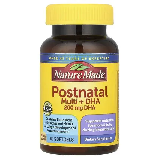 Наповніть свій ранок м’якими капсулами Nature Made Postnatal Multi + 200 мг DHA. Одна м'яка капсула містить фолієву кислоту плюс 19 ключових поживних речовин, включаючи жирні кислоти Омега-3 для підтримки харчування, що забезпечує щоденну підтримку годуючим мамам та їхнім дітям.
