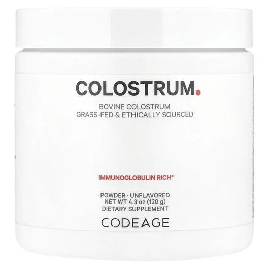 Порошок молозива Codeage Bovine Colostrum Powder виробляється з молочних ферм класу А США, що вирощуються травою, і містить 1000 мг біодоступного молозива без смаку на порцію. Молозиво, перше молоко, яке виробляють ссавці після народження, відоме своєю поживністю та імуноглобулінами. Пастеризовано холодовим ланцюгом, щоб зберегти його поживні властивості. Кожна пляшка забезпечує запас на 4 місяці.