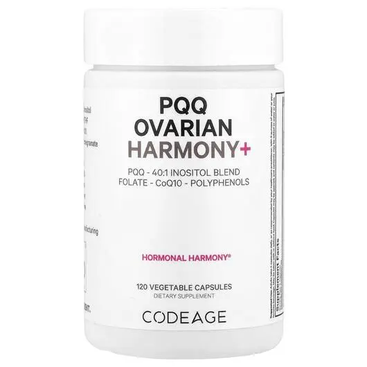 Добавка Codeage PQQ Ovarian Harmony+ розроблена для підтримки здоров’я жінок завдяки унікальній суміші міо-інозитолу, D-хіро-інозитолу, фолієвої кислоти у вигляді 5-MTHF, фітосоми коензиму Q10 і пірролохінолінхінону (PQQ). Покращена екстрактами дикої чорниці та граната, ця формула також має ліпосомну доставку.