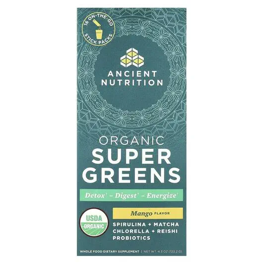 Ancient Nutrition, Organic Super Greens Mango, Супергрінс, 16 шт