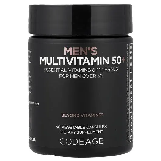 Мультивітамінна добавка Codeage Men's Daily 50+ містить набір необхідних вітамінів та мінералів, включаючи вітаміни A, C, D3, E, B6, B12, біотин та фолат, а також кальцій, цинк, магній, бор та селен.